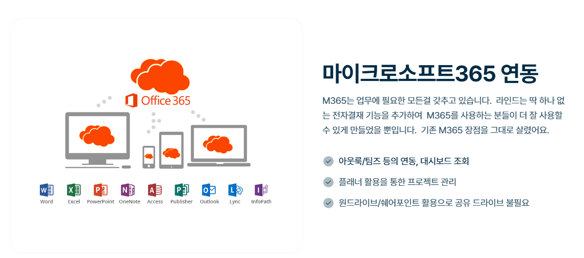 협업툴만으로는 근태·결재·공지 관리가 불가능합니다. 마이크로소프트365·구글워크스페이스와 연동되는 라인드 그룹웨어로 최소 비용, 최대 효과를 경험하세요.